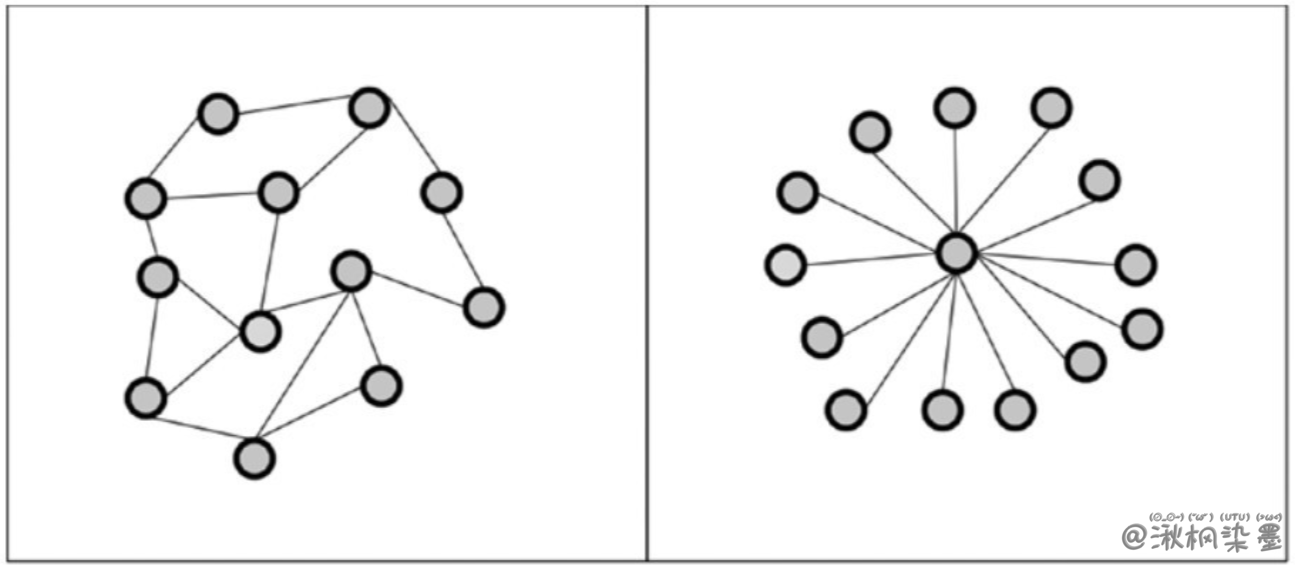 上图形象地描绘了这两类架构。图中的每个圆圈代表了系统的一个模块,也称之为 "节点",圆圈之间的线表示了两个模块之间的联系。左半部分是一个去中心化的系统,其中的各个节点彼此相连,没有一个中心节点同时连接所有其余的节点。而在右半部分的中心化系统中,除了中心节点之外的节点都不和其余节点直接相连,它们只与中心节点直接相连。