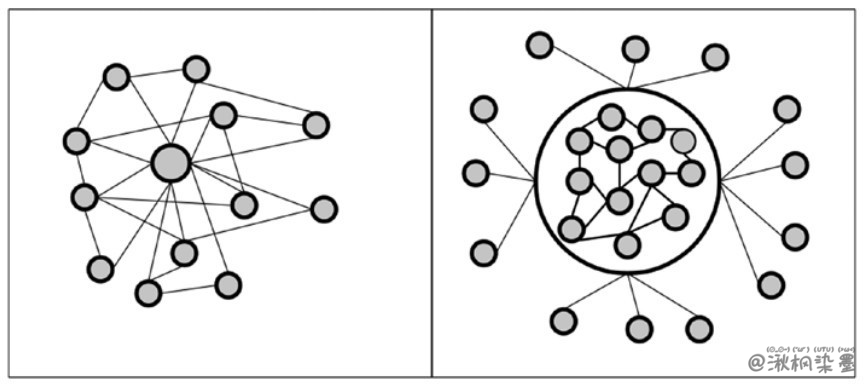 左图是一个拥有中心节点的去中心化系统,因为所有的小圆圈均与中间的大圆相连,实际是中心化系统,右面的系统中心节点是一个去中心化系统。两种架构拥有双重特质,即均具有去中心化系统与中心化系统的优点