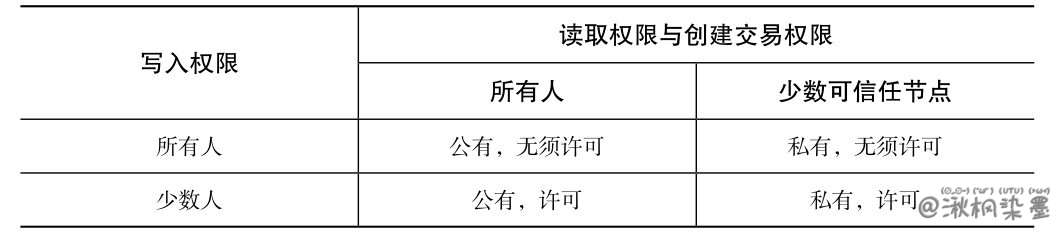 - 使用权:对区块链的读写限制可催生出对各种区块链版本的需求。对数据读取的限制演化出公有链和私有链,而对写入数据权限的限制又诞生出了开放和不开放的区块链。