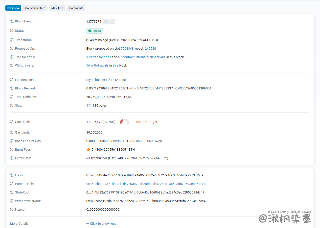 单击区块可显示有关区块的信息以及属于该区块的交易列表。它显示了区块头中的所有详细信息,例如区块散列,父区块散列,矿工账户,难度级别,随机数等,如下所示: