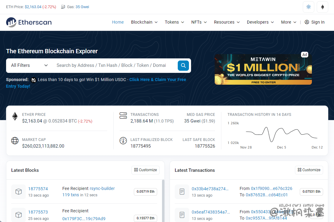 Block Explorer 是一个以太坊浏览器。它提供有关其网络中当前区块和交易的报告和信息。这是了解有关现有和过去更多数据信息的好地方。https://etherscan.io/ (opens new window) 就是个Block Explorer,如下所示: