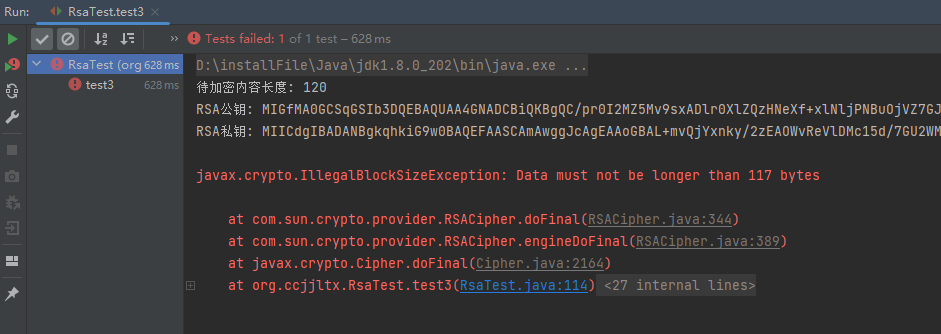 对于1024长度的密钥。128字节(1024bits/8)减去PKCS#1建议的padding就占用了11个字节正好是117字节。所以加密的明文长度120字节大于117字节,程序抛出了异常。