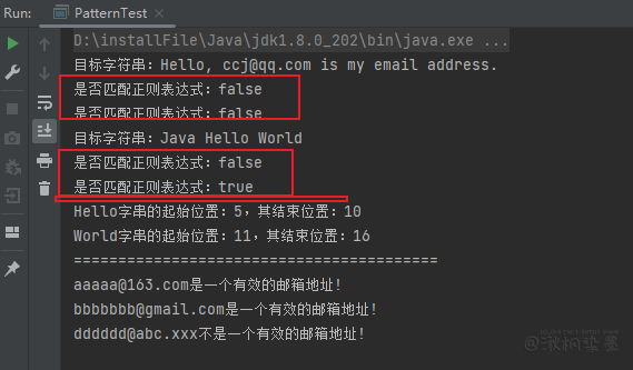 System.out.println(mail + (matcher.matches() ? "是" : "不是") + "一个有效的邮箱地址!");