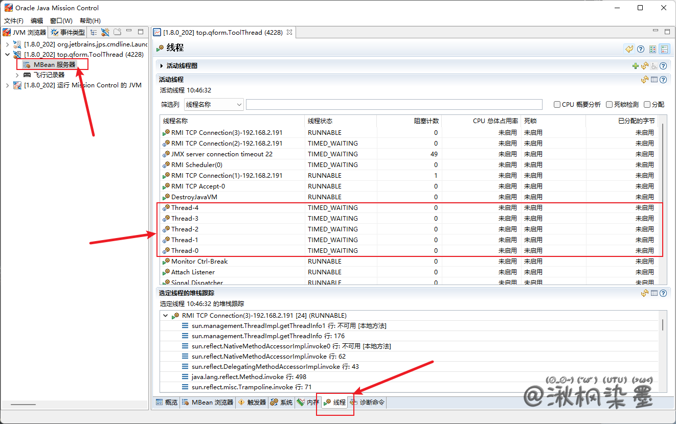 直接通过输入jmc打开,或者手动双击 jmc.exe 打开。关闭欢迎界面,再双击 "MBean服务器",然后单击 "线程" 选项卡
