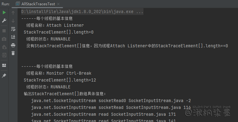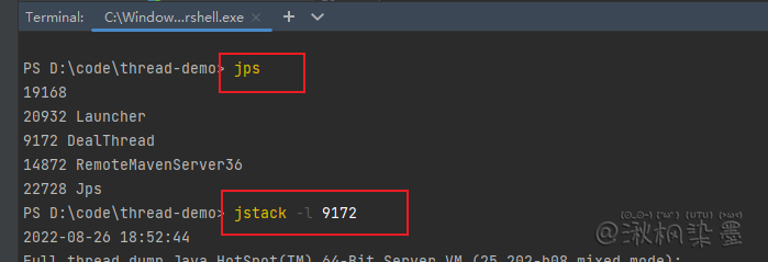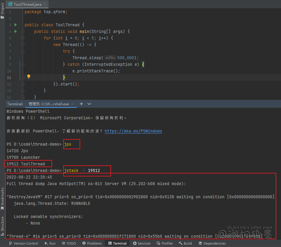 用idea运行上面程序(必须管理员模式),或者单独运行,使用cmd命令查看Java进程,之后使用jstack查看该进程下线程的状态。