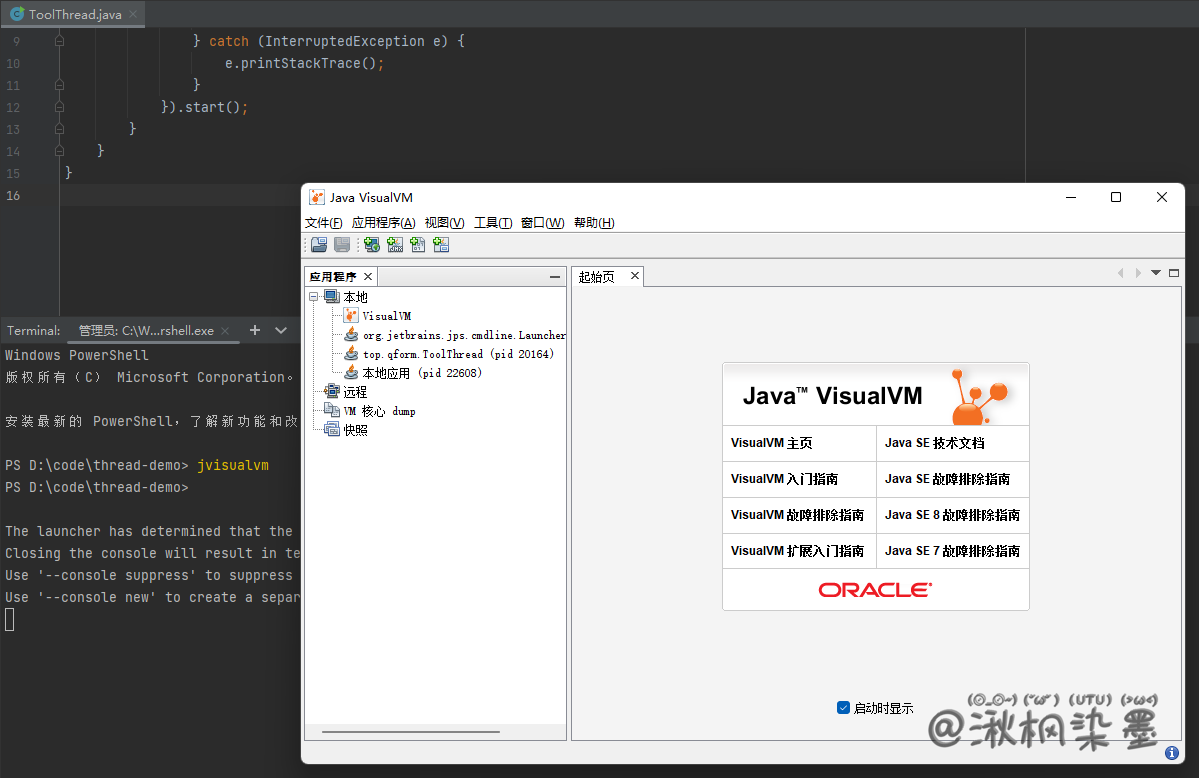 直接通过输入jvisualvm打开,或者手动双击jvisualvm.exe 打开。双击对应进程,再单击 "线程" 选项卡。
