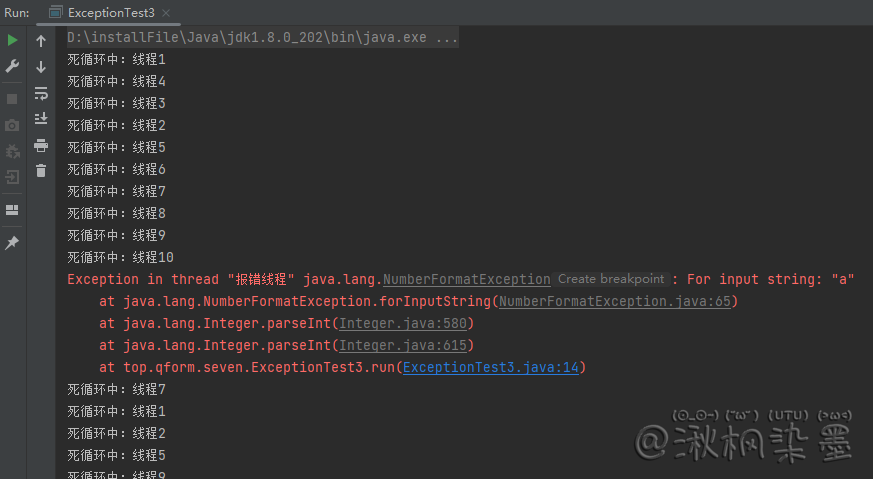 程序运行后,其中一个线程出现了异常,而其他线程一直以死循环的方式持续输出,从程序运行结果来看,在默认情况下,线程组中的一个线程出现异常后不会影响其他线程的运行。