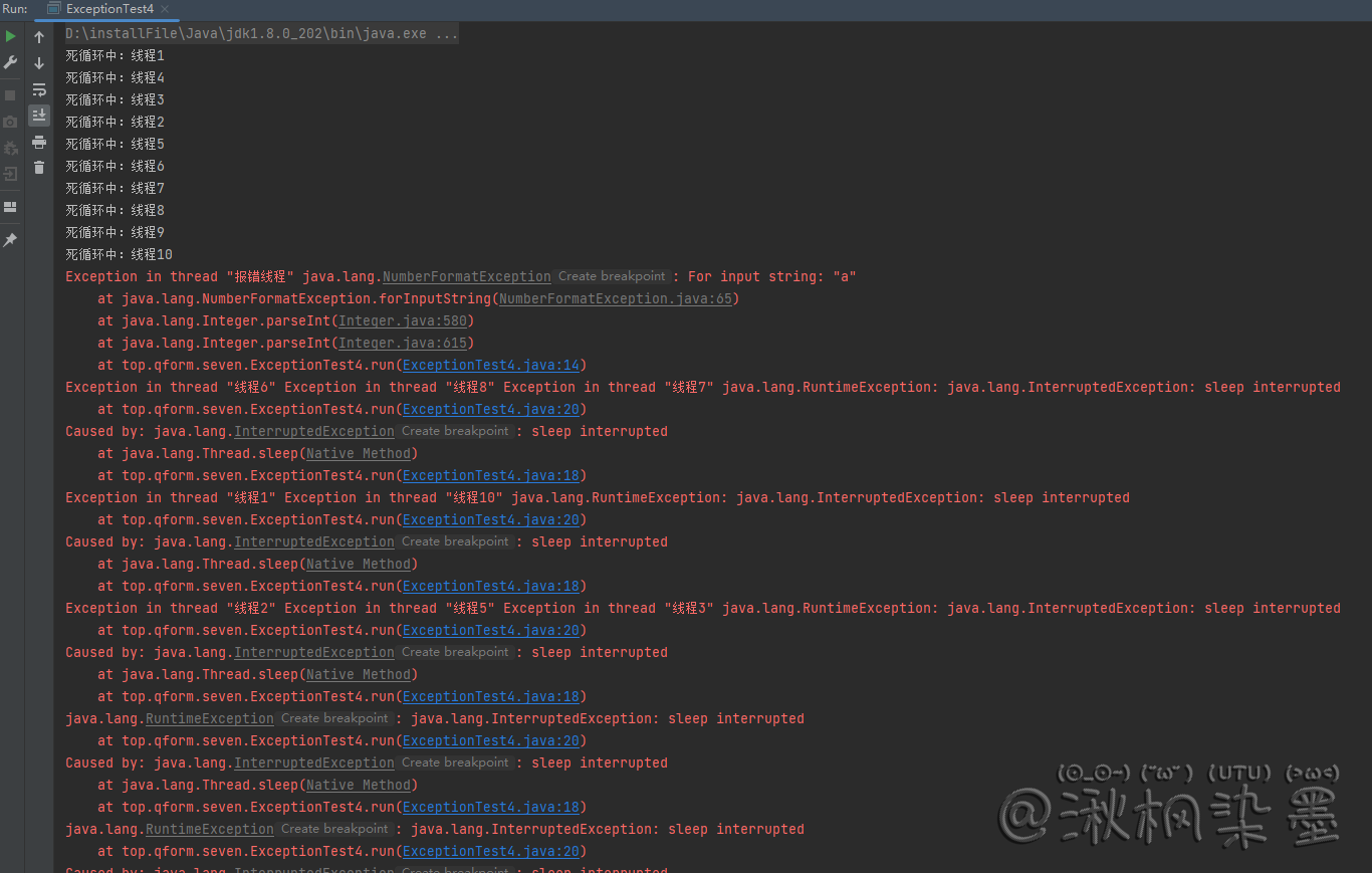 new ExceptionTest4(group, "线程" + (i + 1), "1").start();