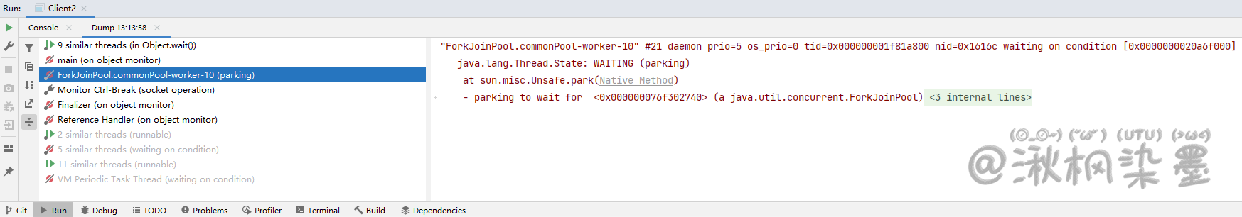 可以发现 ForkJoinPool.commonPool-worke-* 的线程是 RUNNABLE,这个状态并不一定是正在执行,也可能是准备好了,等待执行。