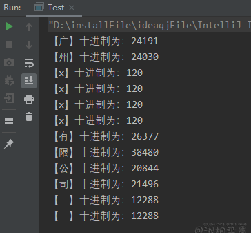 System.out.printf("【%s】十进制为:%d\n", c, (int)c);