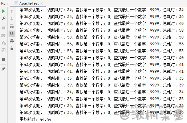 System.out.printf("切割耗时:%d", System.currentTimeMillis() - start);