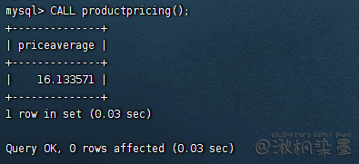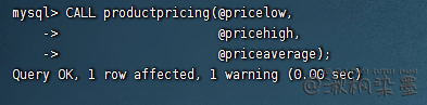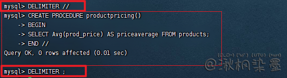 说明:创建存储过程名为productpricing;第一行 () 内,可以定义参数,BEGIN和END用来限定存储过程体。
