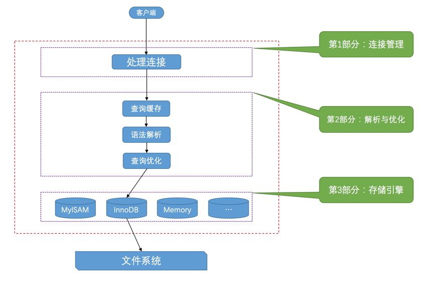 从图中可以看出,服务器程序处理来自客户端的查询请求大致需要经过三个部分,分别是 连接管理 、解析与优化 、存储引擎。