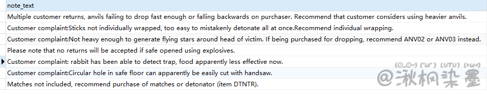 | Anvils R Us | 1 ton anvil | 9.99 |