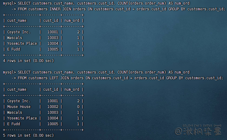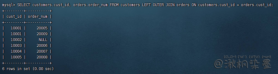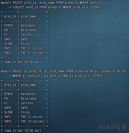 利用WHERE子句建立连接关系似乎有点奇怪,但实际上,有一个很充分的理由。一条SELECT语句中连接几个表时,相应的关系是在运行中构造的。在数据库表的定义中不存在能指示MySQL如何对表进行连接的东西。没有WHERE子句,第一个表中的每个行将与第二个表中的每个行配对,而不管它们逻辑上是否可以配在一起。