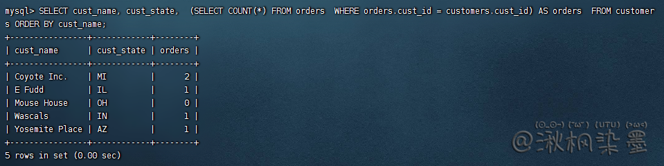 分析:该子查询对检索出的每个客户执行一次。在此例子中,该子查询执行了5次,因为检索出了5个客户。