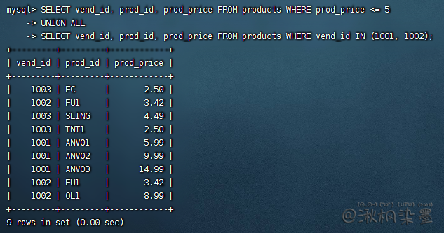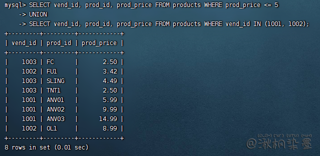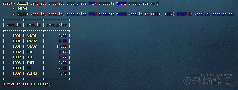 虽然 ORDER BY 子句似乎只是最后一条 SELECT 语句的组成部分,但实际上MySQL将用它来排序所有 SELECT 语句返回的所有结果。