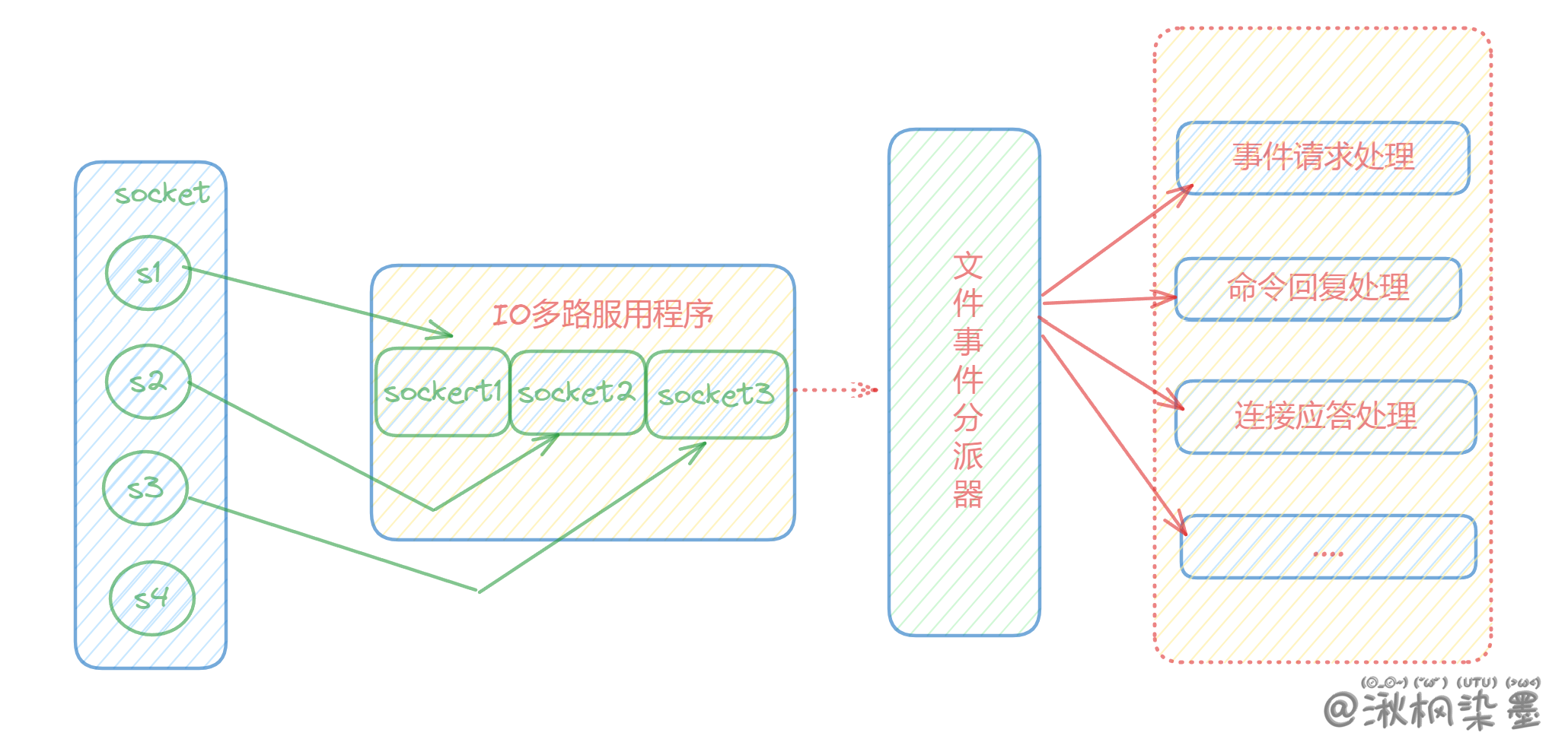 IO 多路复用程序负责监听多个套接字并向文件事件分派器传送那些产生了事件的套接字。文件事件分派器接收 IO 多路复用程序传来的套接字,并根据套接字产生的事件的类型,调用相应的事件处理器。如图所示: