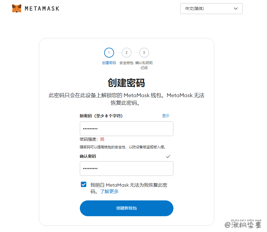 - 确认隐私提醒和用户协议后,在创建一个密钥时,需要提供保护密码。这些信息存储在 MetaMask 服务器的密钥库里。