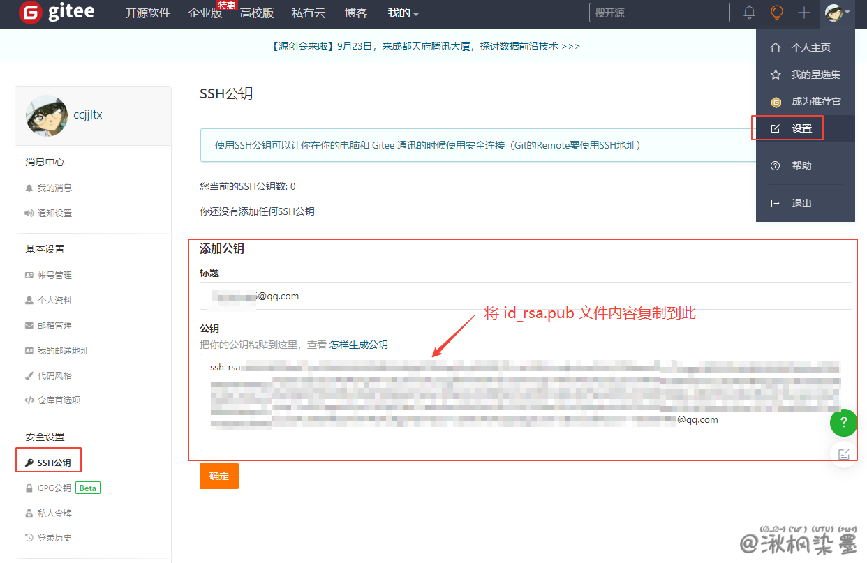 主页右上角 「设置」->「安全设置」->「SSH公钥」->「添加公钥」 ,添加生成的公钥。
