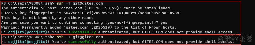 首次使用需要确认并添加主机到本机SSH可信列表。若返回 Hi XXX! You've successfully authenticated, but Gitee.com does not provide shell access.